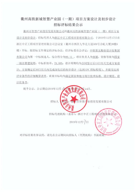 衢州市智慧產(chǎn)業(yè)投資發(fā)展有限公司的衢州高鐵新城智慧產(chǎn)業(yè)園(一期)項(xiàng)目方案設(shè)計(jì)及初步設(shè)計(jì),招標(biāo)代理人為浙江中正工程項(xiàng)目管理有限公司,于2019年12月17日在浙江中正工程項(xiàng)目管理有限公司會(huì)議室(衢州市西區(qū)九華北大道509號(hào)合屹大廈2#樓9樓)開(kāi)標(biāo)。按招標(biāo)文件規(guī)定的評(píng)標(biāo)辦法,經(jīng)評(píng)標(biāo)委員會(huì)評(píng)定:中鐵第五勘察設(shè)計(jì)院集團(tuán)有限公司為第一中標(biāo)候選人,綜合得分為90.11 ,項(xiàng)目負(fù)責(zé)人為宋穎,資格等級(jí)為國(guó)家一級(jí)注冊(cè)建筑師;中標(biāo)折扣率:78.88%;設(shè)計(jì)周期均為合同簽訂后15日歷天完成方案設(shè)計(jì);方案確定后30日歷天內(nèi)完成深化后的初步設(shè)計(jì)(達(dá)到EPC招標(biāo)程度),并提交達(dá)到評(píng)審條件的詳細(xì)概算清單。質(zhì)量目標(biāo)均為滿足國(guó)家和地方現(xiàn)行技術(shù)標(biāo)準(zhǔn)、設(shè)計(jì)規(guī)范、設(shè)計(jì)任務(wù)書(shū)。