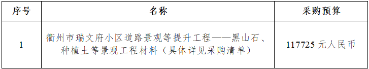 根據(jù)《衢州市市屬國有企業(yè)采購管理辦法(試行)》規(guī)定,以公開詢價(jià)方式對(duì)衢州市瑞文府小區(qū)道路景觀等提升工程——黑山石、種植土等景觀工程材料進(jìn)行采購,歡迎合格的供應(yīng)商參加。