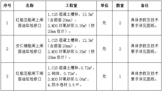 一、采購內(nèi)容:紅船豆、安仁輔船閘閘首油缸檢修口擴(kuò)孔改造,詳見下表,采購預(yù)算價為人民幣66000元。