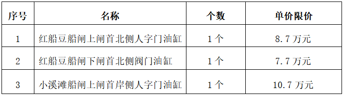 紅船豆船閘、小溪灘船閘故障液壓缸維修項(xiàng)目,需維修的故障液壓缸共3個(gè),采購(gòu)總預(yù)算價(jià)為人民幣27.1萬(wàn)元。(具體單價(jià)限價(jià)詳見(jiàn)下表)