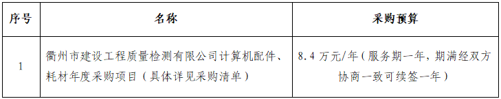根據(jù)《衢州市市屬國有企業(yè)采購管理辦法(試行)》規(guī)定,以公開詢價方式對衢州市建設(shè)工程質(zhì)量檢測有限公司計(jì)算機(jī)配件、耗材進(jìn)行年度采購,歡迎合格的供應(yīng)商參加。