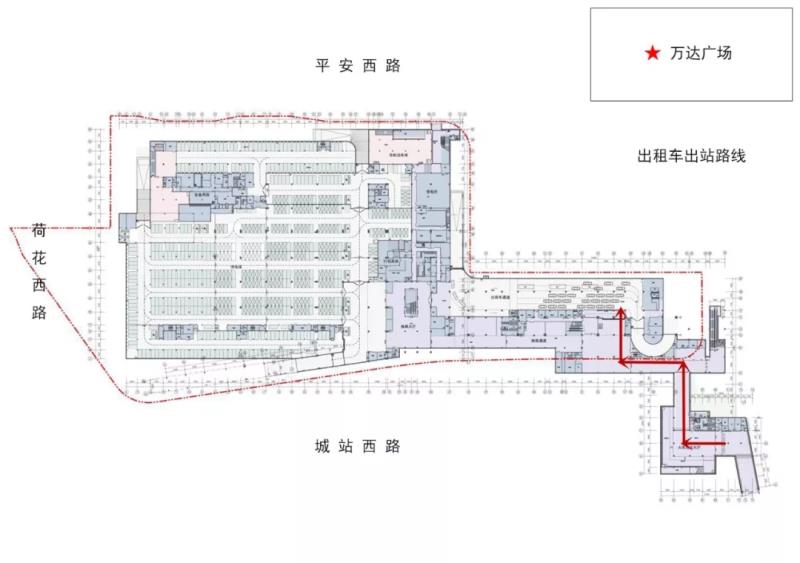 鐵路出站閘機口——右轉(zhuǎn)后步行20米左轉(zhuǎn)——步行50米后,到達第一換乘大廳——右轉(zhuǎn)進入出租車乘客等候區(qū)——通過出租車行駛車道由東向西沿城站西路駛出。