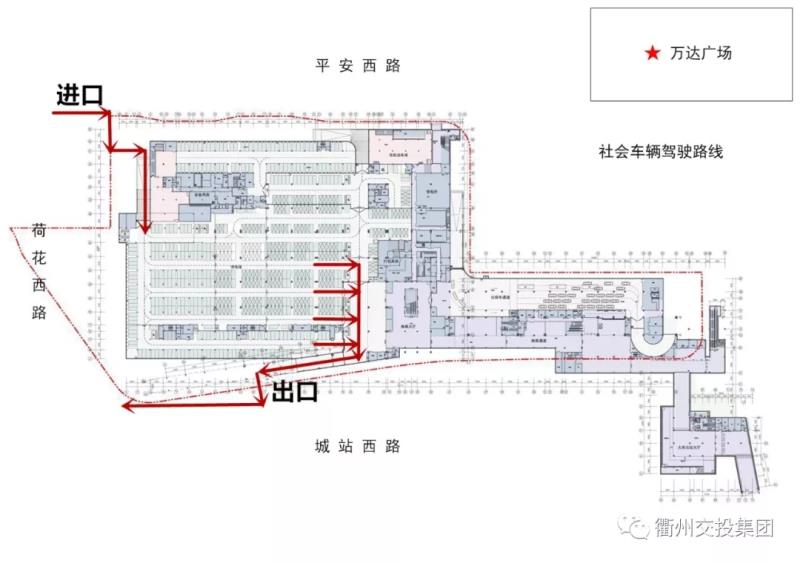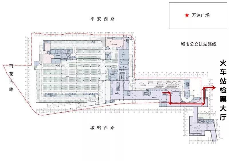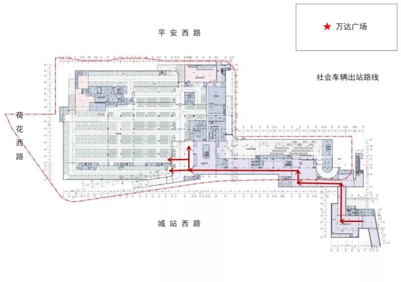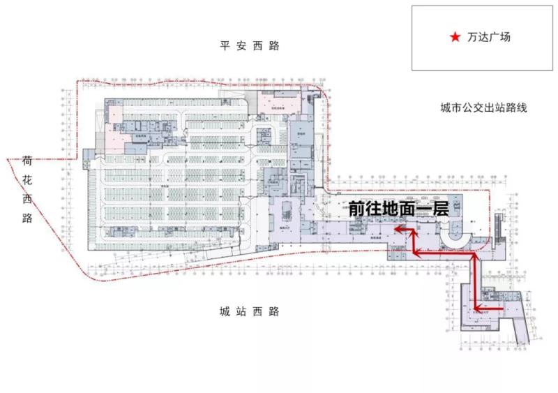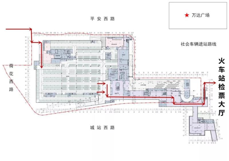 車輛從平安西路進入綜合客運樞紐的南側(cè)汽車坡道駛?cè)氲叵峦\噲觥7跑囕v——由西向東經(jīng)第二、第一換乘大廳直走到頭——左轉(zhuǎn)乘坐扶梯或無障礙電梯向上——右轉(zhuǎn)抵達火車站出發(fā)層。