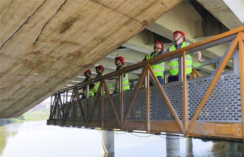 為順利完成該項目檢測工作,交科檢測公司制定了檢測技術(shù)方案,組織從事路基工程、路面工程、橋梁工程等工作的專業(yè)技術(shù)人員,前往現(xiàn)場進行勘探、資料收集、檢測方案交底、校驗檢查儀器設(shè)備,為項目檢測做好前期準(zhǔn)備工作。同時,細化檢測人員的分工與職責(zé),分別組成檢測組和安全保障組,參加現(xiàn)場檢測工作。并將檢測組分為實體檢測組和外觀檢查組兩個組別,下設(shè)橋梁組、路線組、交安組等進行統(tǒng)籌安排,全面、高效地開展工作。
