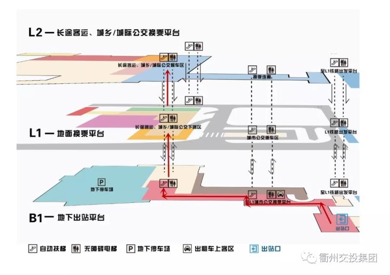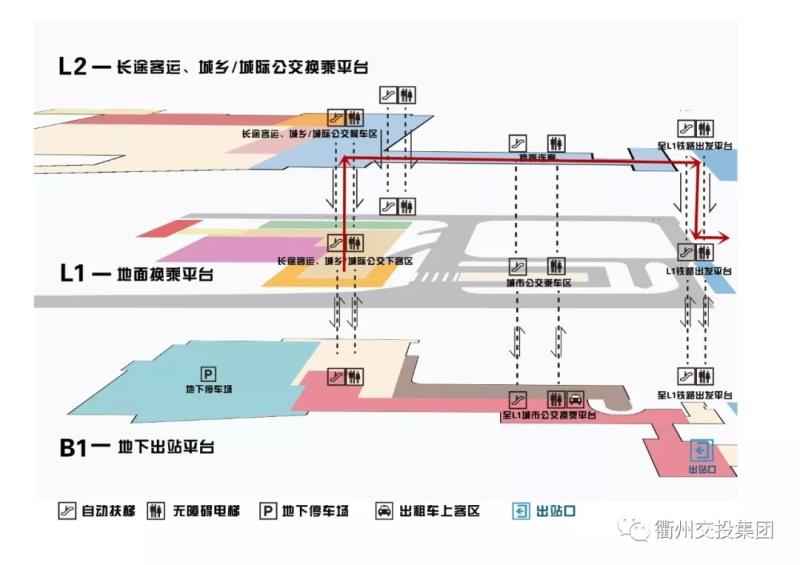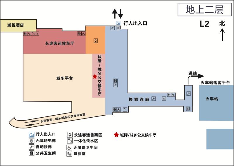 抵達(dá)地面一層城鄉(xiāng)/城際公交下客區(qū)——乘坐自動扶梯或無障礙電梯前往二樓——右轉(zhuǎn)后由西向東步行通過換乘連廊——抵達(dá)盡頭后乘坐自動扶梯或無障礙電梯向下——右轉(zhuǎn)至鐵路出發(fā)平臺。