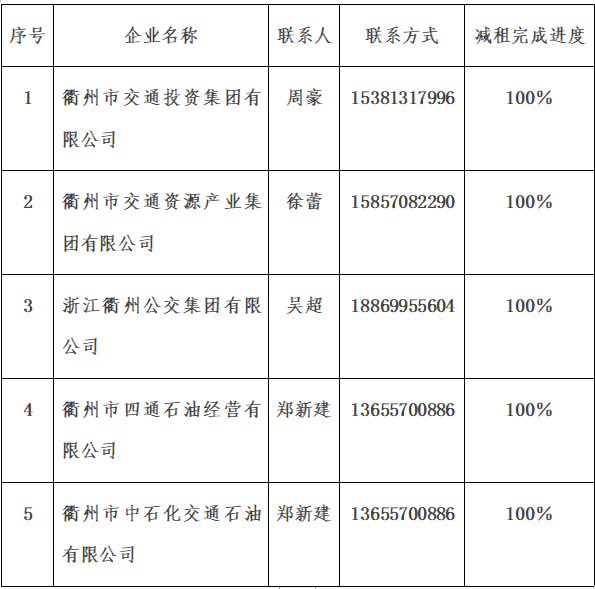 截至5月31日,衢州市交通投資集團(tuán)有限公司應(yīng)減租金332.51萬(wàn)元,涉及承租戶14戶;已減租金332.51萬(wàn)元,占應(yīng)減租金的100%,已減租14戶,占應(yīng)減承租戶的100%;其中,小微企業(yè)應(yīng)減房租254.02萬(wàn)元,涉及承租戶4戶,已減租金254.02萬(wàn)元,已減租4戶;個(gè)體工商戶應(yīng)減房租78.49萬(wàn)元,涉及承租戶10戶,已減租金78.49萬(wàn)元,已減租10戶。感謝您對(duì)國(guó)有企業(yè)減租工作的理解和支持。