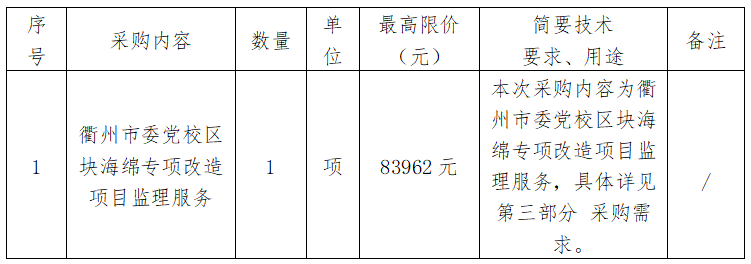 根據(jù)《衢州市國有企業(yè)采購管理辦法(試行)》規(guī)定并參照《中華人民共和國招標(biāo)投標(biāo)法》、《中華人民共和國政府采購法》等有關(guān)規(guī)定,衢州市兩山工程咨詢管理有限公司受衢州市智慧產(chǎn)業(yè)投資發(fā)展有限公司的委托,對(duì)衢州市委黨校區(qū)塊海綿專項(xiàng)改造項(xiàng)目監(jiān)理服務(wù)進(jìn)行詢價(jià)采購,歡迎準(zhǔn)時(shí)參加。