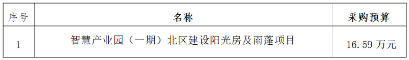 一、采購(gòu)項(xiàng)目名稱:智慧產(chǎn)業(yè)園(一期)北區(qū)建設(shè)陽(yáng)光房及雨蓬項(xiàng)目