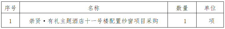 一、采購(gòu)項(xiàng)目名稱(chēng):崇賢·有禮主題酒店十一號(hào)樓配置紗窗項(xiàng)目