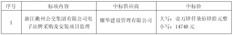 浙江建安工程管理有限公司關(guān)于浙江衢州公交集團有限公司電子站牌采購及安裝項目監(jiān)理的中標結(jié)果公告