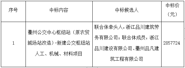 根據(jù)《中華人民共和國招標(biāo)投標(biāo)法》等有關(guān)法律法規(guī)的規(guī)定,浙江建安工程管理有限公司受浙江衢交建設(shè)工程有限公司委托,對其衢州公交中心樞紐站(原農(nóng)貿(mào)城場站改造)-新建公交樞紐站人工、機械、材料項目采用公開招標(biāo)方式進(jìn)行招標(biāo)。浙江建安工程管理有限公司于2021年6月17日09時30分在衢州市交通投資集團二樓開標(biāo)廳(衢州市柯城區(qū)白云街道花園中大道86號)進(jìn)行開評標(biāo)。評標(biāo)結(jié)果及相關(guān)事宜現(xiàn)公示如下: