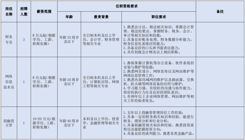根據(jù)集團(tuán)今后發(fā)展的需要,擬向社會(huì)公開招聘工作人員13名,實(shí)際工作崗位由集團(tuán)根據(jù)需要在集團(tuán)本部和全資子公司崗位進(jìn)行統(tǒng)籌安排。具體招聘事項(xiàng)如下: