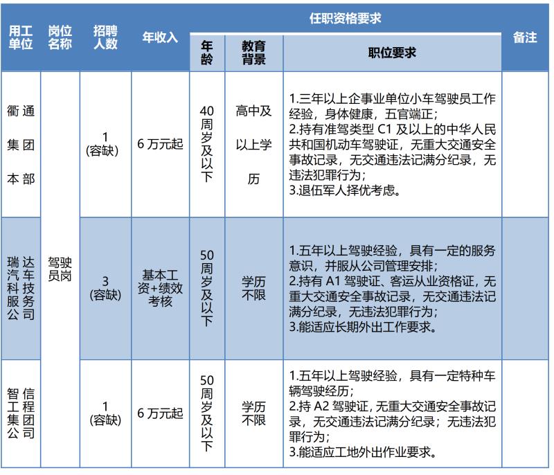 小車駕駛員1名,商務(wù)車、客車駕駛員崗3名,設(shè)備車輛駕駛員1名。