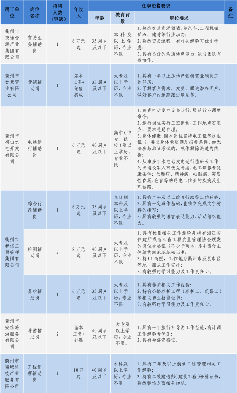 衢州市衢通發(fā)展集團有限公司因工作需要,現(xiàn)面向社會公開招聘10名勞務(wù)派遣人員。具體事項公告如下: