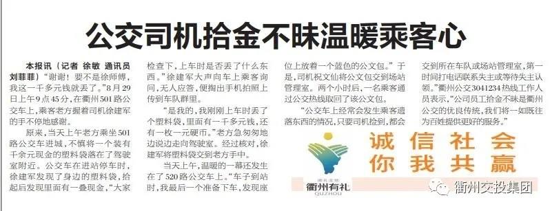 衢州日報 | 公交司機拾金不昧溫暖乘客心